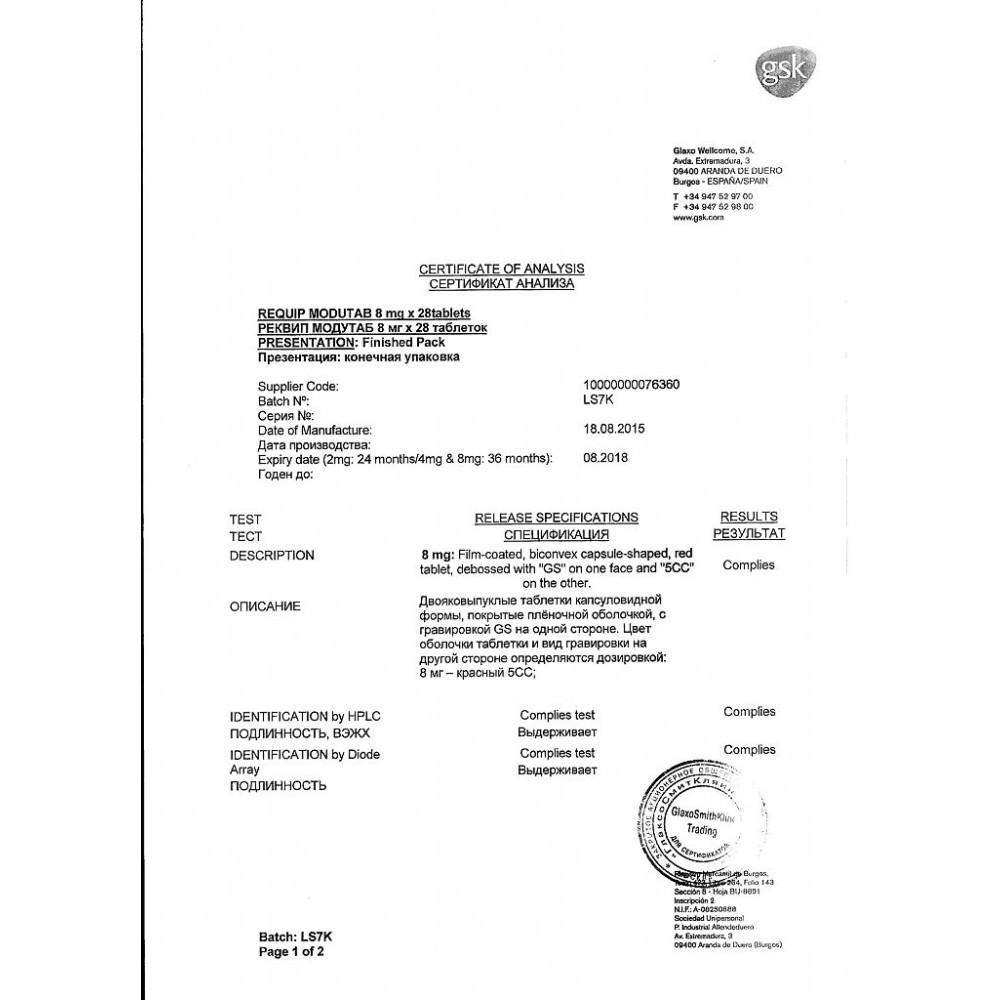 Показания. Рекомендовано купить Реквип Модутаб для монотерапии ранних стадий болезни Паркинсона. Также препарат эффективен в составе комбинированной терапии у пациентов, получающих препараты леводопы.
