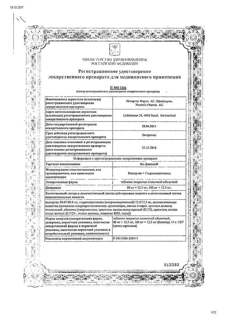 Применение. Дозировку препарата Ко-Диован подбирает врач индивидуально. Стандартная дозировка для взрослых составляет 1 табл. 80 мг/12,5 мг 1 раз в сутки ежедневно. При недостаточном снижении артериального давления через 3–4 нед лечения рекомендуется рассмотреть возможность продолжения лечения в дозе 1 таблетка Co-Diovan 160 мг/12,5 мг/сут.